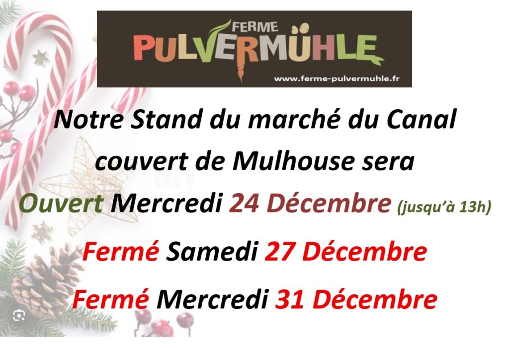Ouverture stand Marché Mulhouse Chers clients, chères clientes, Notre Stand du marché du Canal Couvert de Mulhouse sera: Ouvert Mercredi 24 Décembre (jusqu’à 13h) Fermé Samedi 27 Décembre Fermé Mercredi 31 Décembre FacebookTwitterPinterestemail
